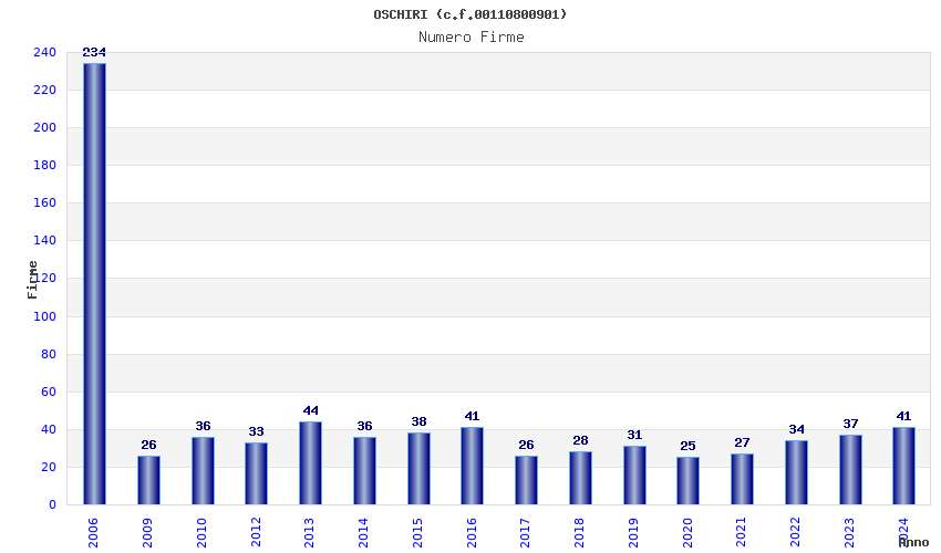 | Anno | Firme | Importi | Media | Naz. | Reg. | Prov. | Comu. |