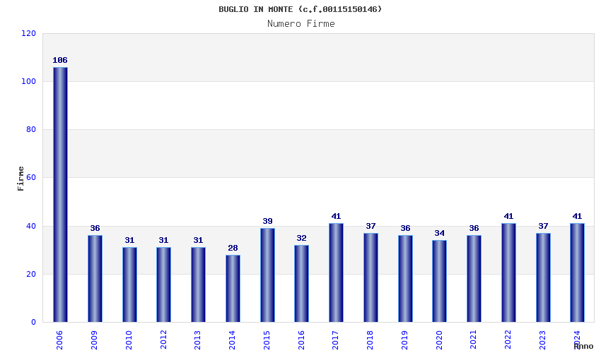 | Anno | Firme | Importi | Media | Naz. | Reg. | Prov. | Comu. |
