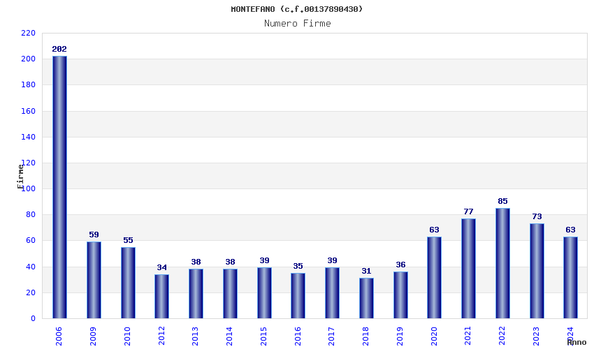 | Anno | Firme | Importi | Media | Naz. | Reg. | Prov. | Comu. |