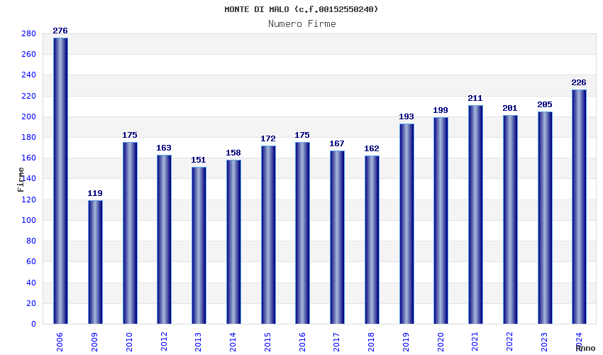 | Anno | Firme | Importi | Media | Naz. | Reg. | Prov. | Comu. |