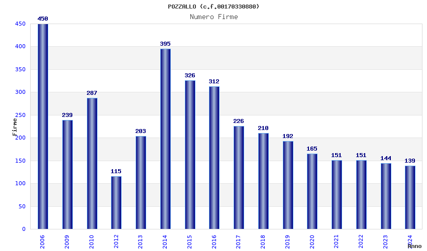| Anno | Firme | Importi | Media | Naz. | Reg. | Prov. | Comu. |