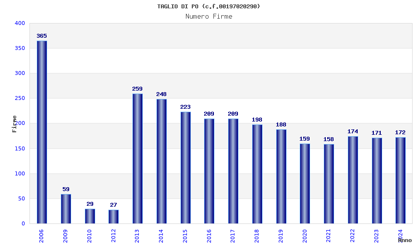 | Anno | Firme | Importi | Media | Naz. | Reg. | Prov. | Comu. |
