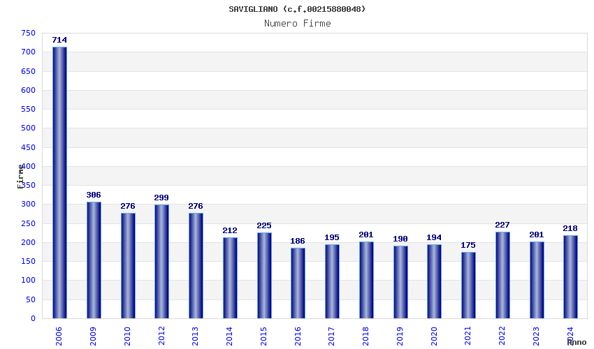 | Anno | Firme | Importi | Media | Naz. | Reg. | Prov. | Comu. |