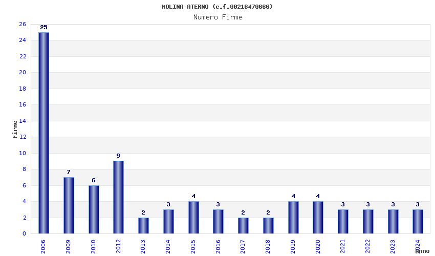 | Anno | Firme | Importi | Media | Naz. | Reg. | Prov. | Comu. |