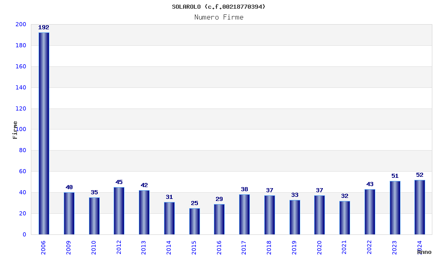 | Anno | Firme | Importi | Media | Naz. | Reg. | Prov. | Comu. |