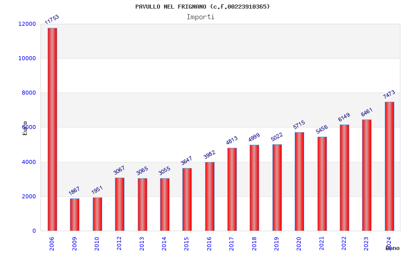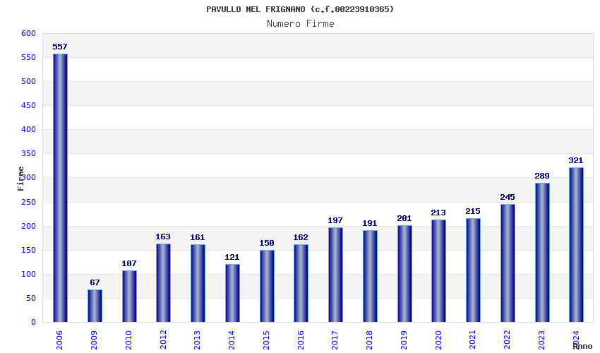 | Anno | Firme | Importi | Media | Naz. | Reg. | Prov. | Comu. |