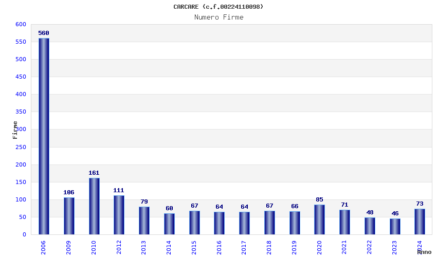 | Anno | Firme | Importi | Media | Naz. | Reg. | Prov. | Comu. |