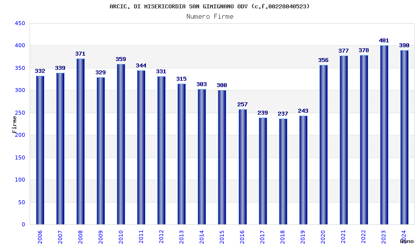 | Anno | Firme | Importi | Media | Naz. | Reg. | Prov. | Comu. |