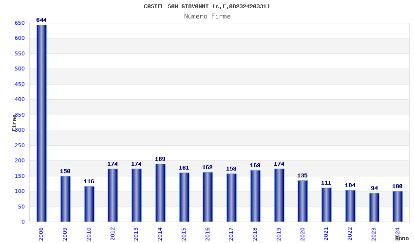 | Anno | Firme | Importi | Media | Naz. | Reg. | Prov. | Comu. |