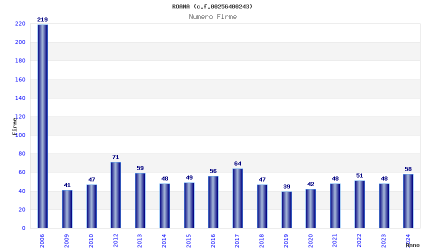 | Anno | Firme | Importi | Media | Naz. | Reg. | Prov. | Comu. |
