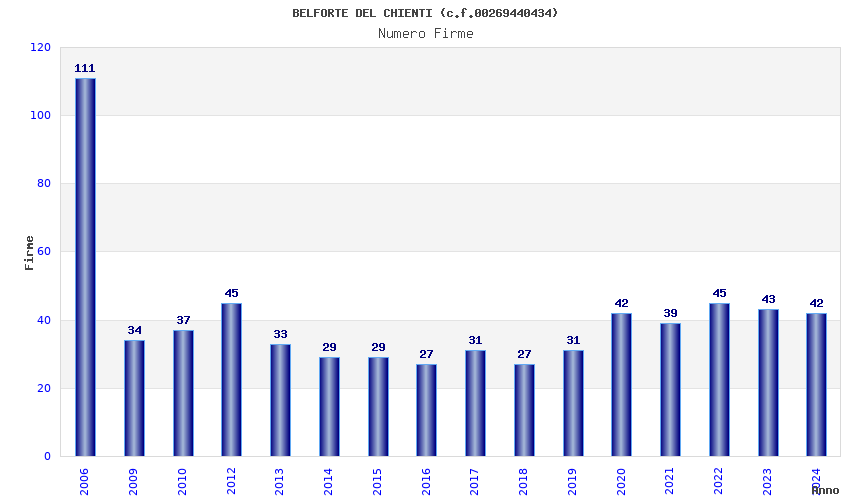 | Anno | Firme | Importi | Media | Naz. | Reg. | Prov. | Comu. |