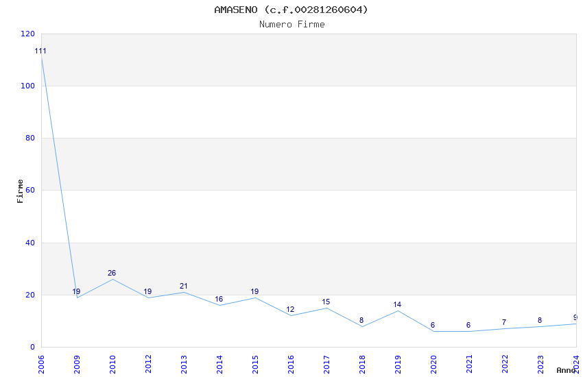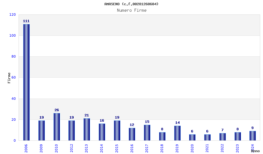 | Anno | Firme | Importi | Media | Naz. | Reg. | Prov. | Comu. |