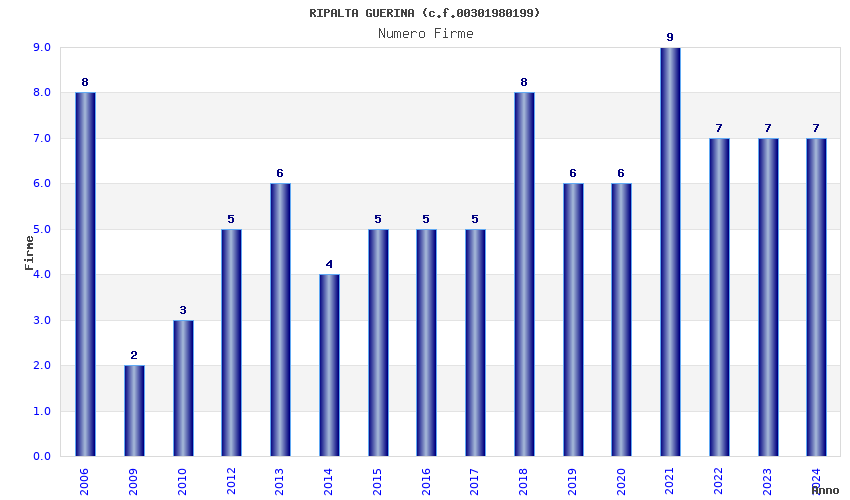 | Anno | Firme | Importi | Media | Naz. | Reg. | Prov. | Comu. |