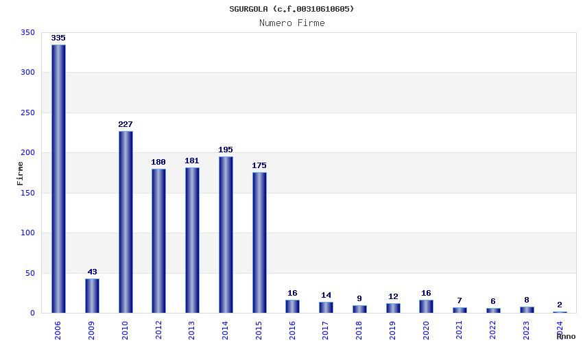 | Anno | Firme | Importi | Media | Naz. | Reg. | Prov. | Comu. |
