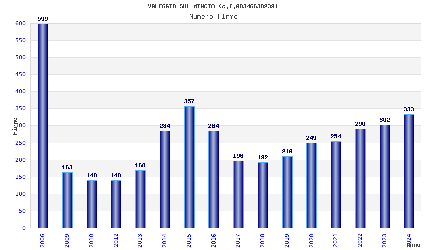 | Anno | Firme | Importi | Media | Naz. | Reg. | Prov. | Comu. |