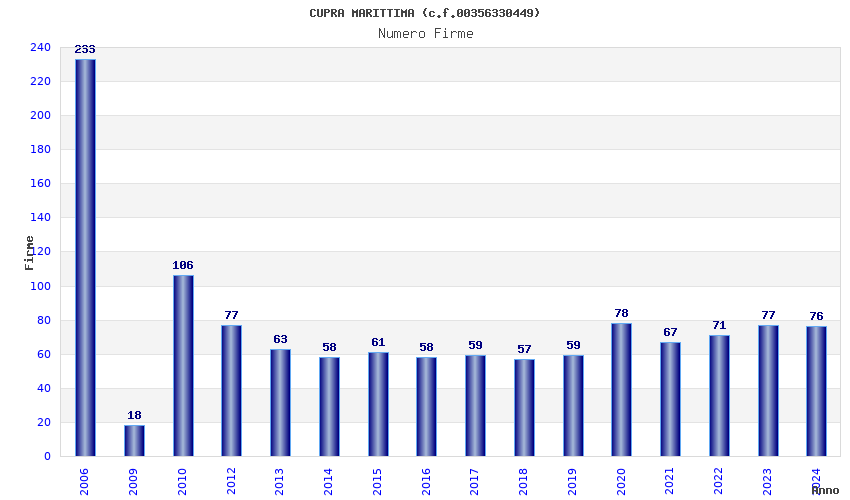 | Anno | Firme | Importi | Media | Naz. | Reg. | Prov. | Comu. |