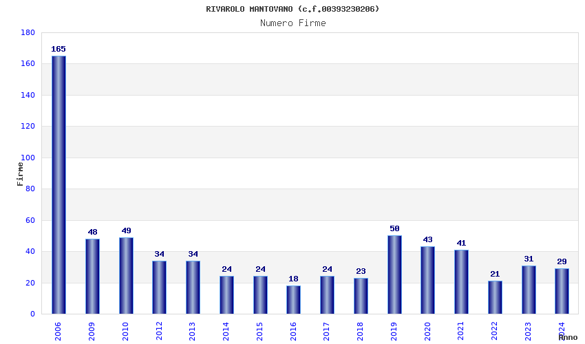 | Anno | Firme | Importi | Media | Naz. | Reg. | Prov. | Comu. |