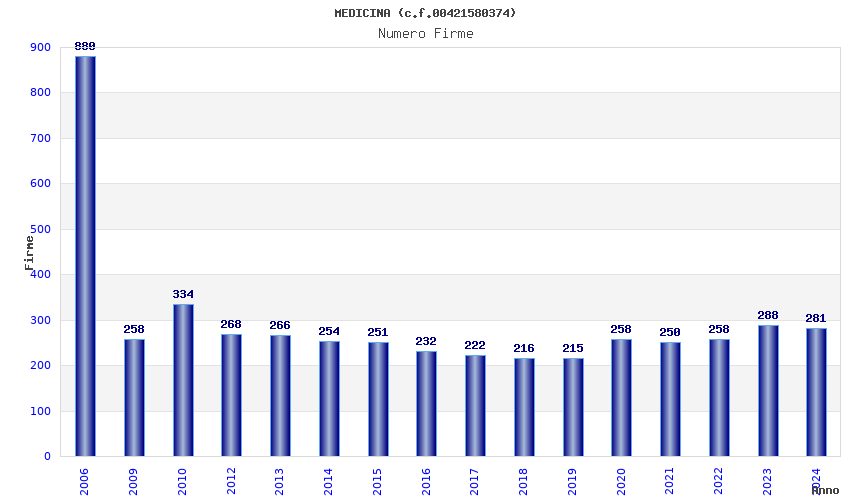 | Anno | Firme | Importi | Media | Naz. | Reg. | Prov. | Comu. |