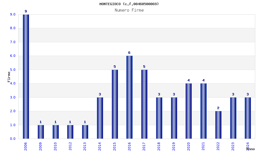| Anno | Firme | Importi | Media | Naz. | Reg. | Prov. | Comu. |
