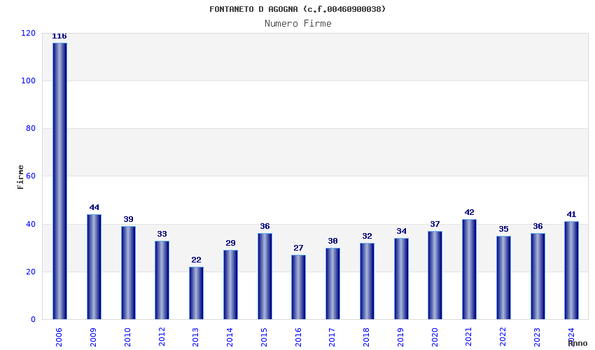 | Anno | Firme | Importi | Media | Naz. | Reg. | Prov. | Comu. |