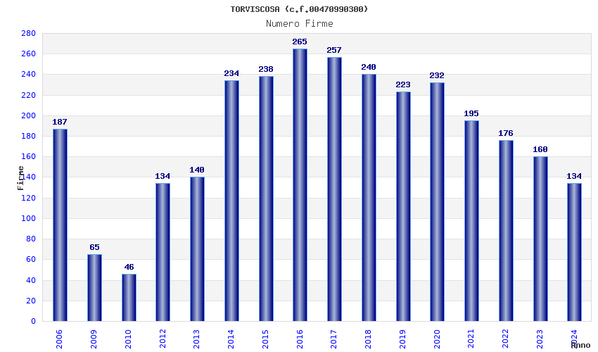 | Anno | Firme | Importi | Media | Naz. | Reg. | Prov. | Comu. |