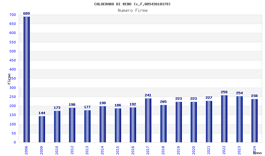 | Anno | Firme | Importi | Media | Naz. | Reg. | Prov. | Comu. |