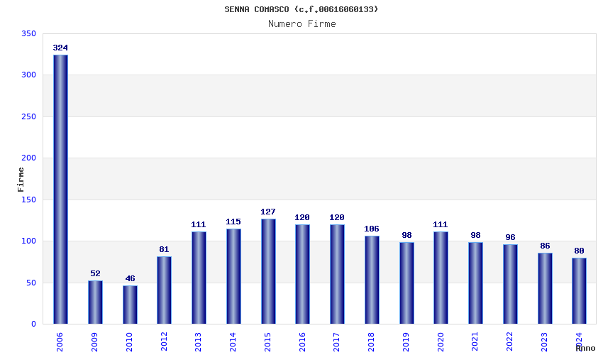 | Anno | Firme | Importi | Media | Naz. | Reg. | Prov. | Comu. |