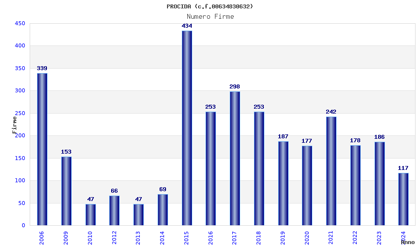 | Anno | Firme | Importi | Media | Naz. | Reg. | Prov. | Comu. |