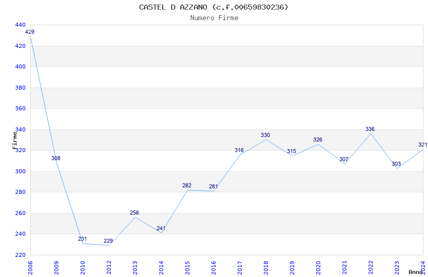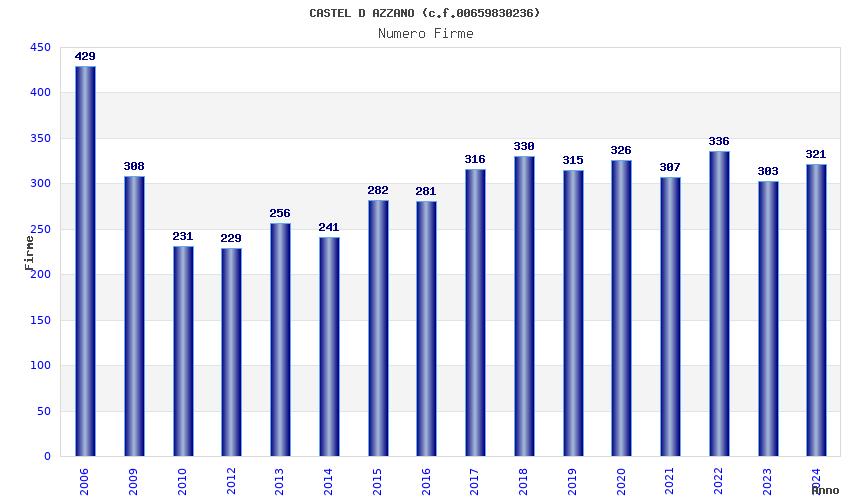 | Anno | Firme | Importi | Media | Naz. | Reg. | Prov. | Comu. |