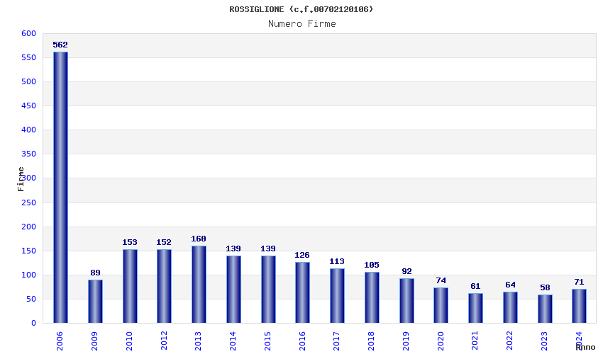 | Anno | Firme | Importi | Media | Naz. | Reg. | Prov. | Comu. |