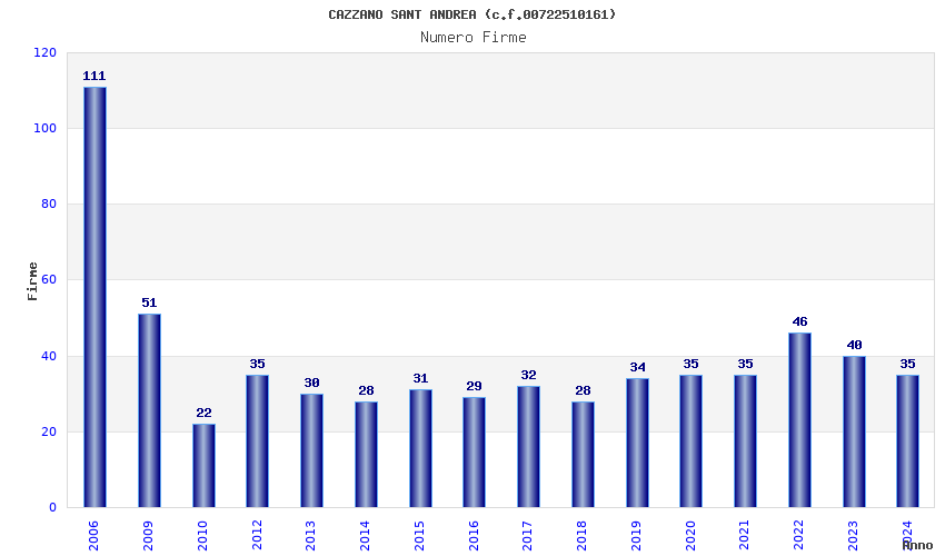 | Anno | Firme | Importi | Media | Naz. | Reg. | Prov. | Comu. |