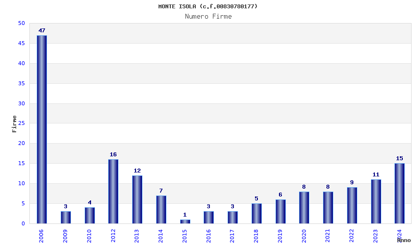 | Anno | Firme | Importi | Media | Naz. | Reg. | Prov. | Comu. |