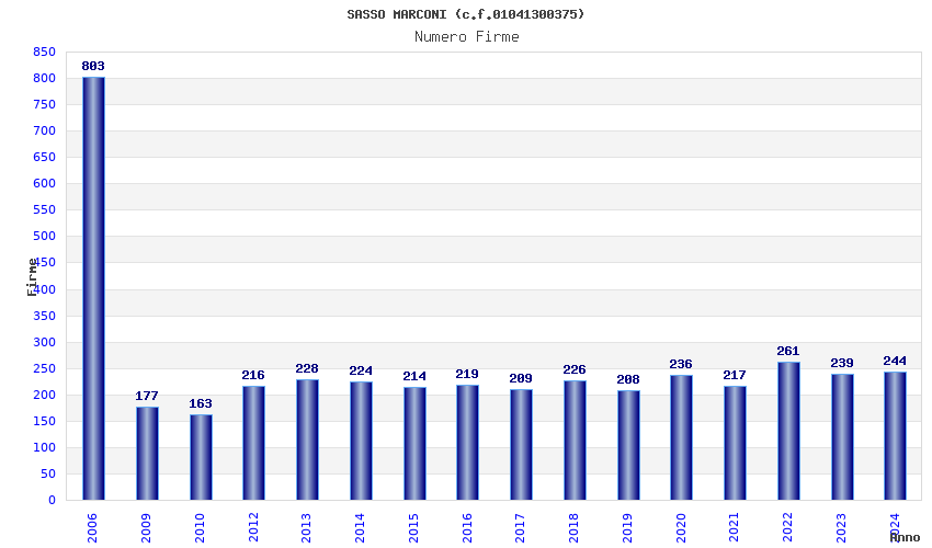 | Anno | Firme | Importi | Media | Naz. | Reg. | Prov. | Comu. |