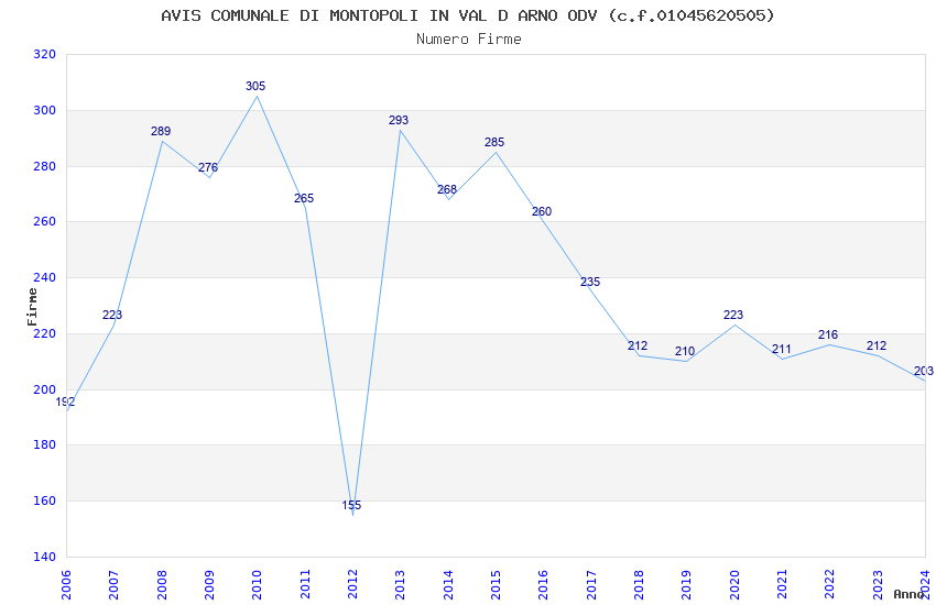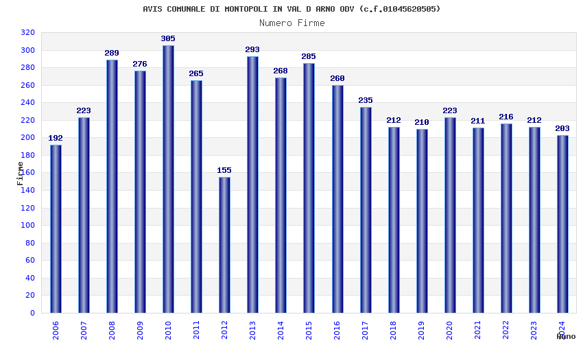 | Anno | Firme | Importi | Media | Naz. | Reg. | Prov. | Comu. |