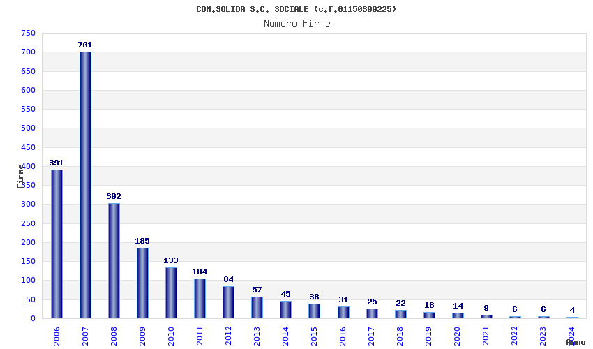 | Anno | Firme | Importi | Media | Naz. | Reg. | Prov. | Comu. |