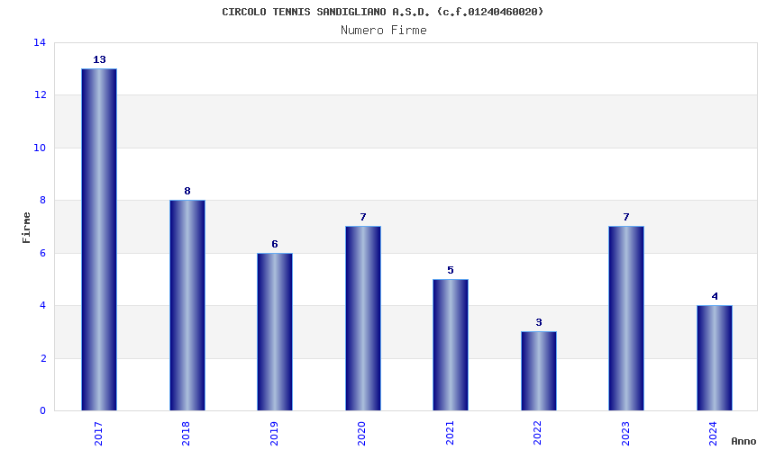 | Anno | Firme | Importi | Media | Naz. | Reg. | Prov. | Comu. |