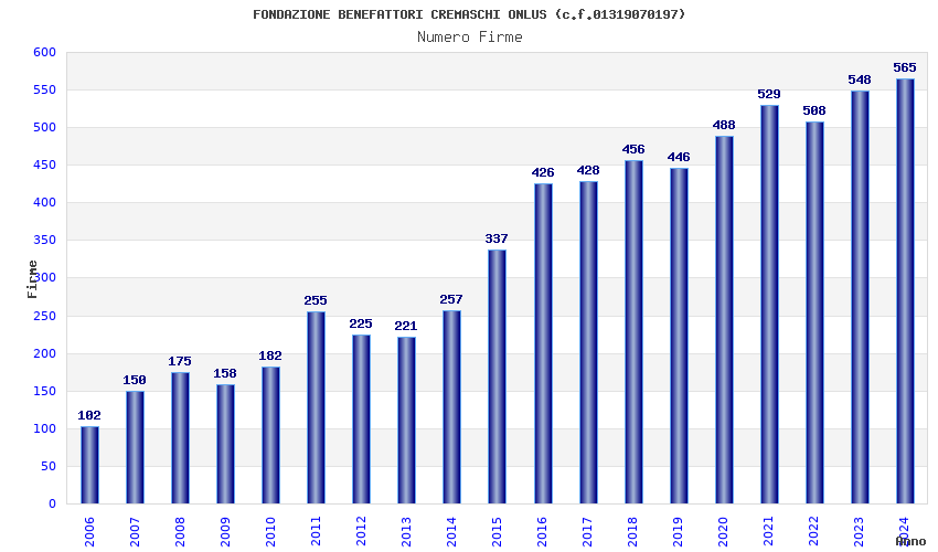 | Anno | Firme | Importi | Media | Naz. | Reg. | Prov. | Comu. |