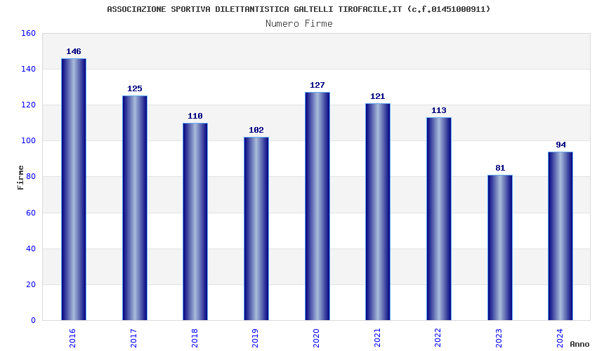 | Anno | Firme | Importi | Media | Naz. | Reg. | Prov. | Comu. |