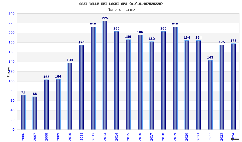 | Anno | Firme | Importi | Media | Naz. | Reg. | Prov. | Comu. |