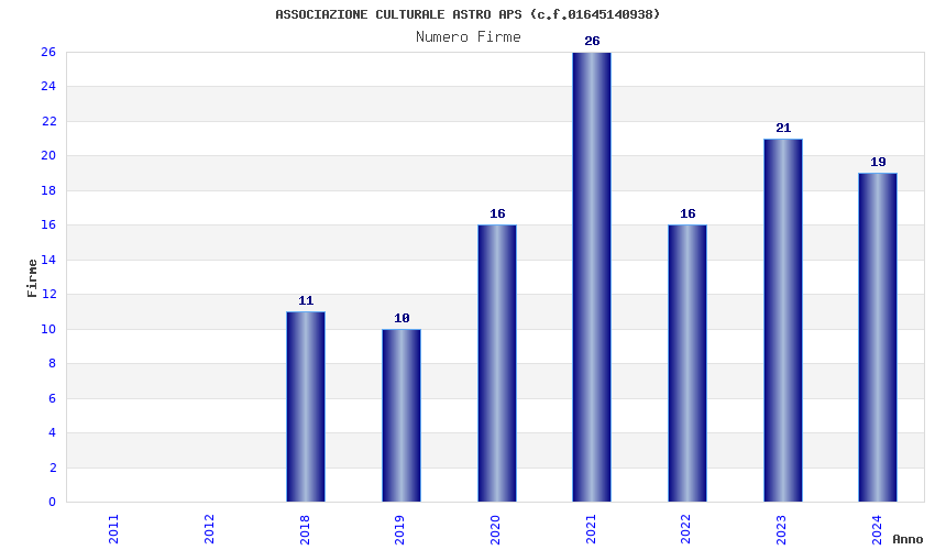 | Anno | Firme | Importi | Media | Naz. | Reg. | Prov. | Comu. |