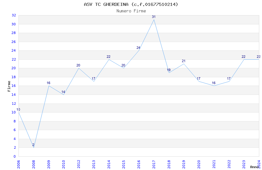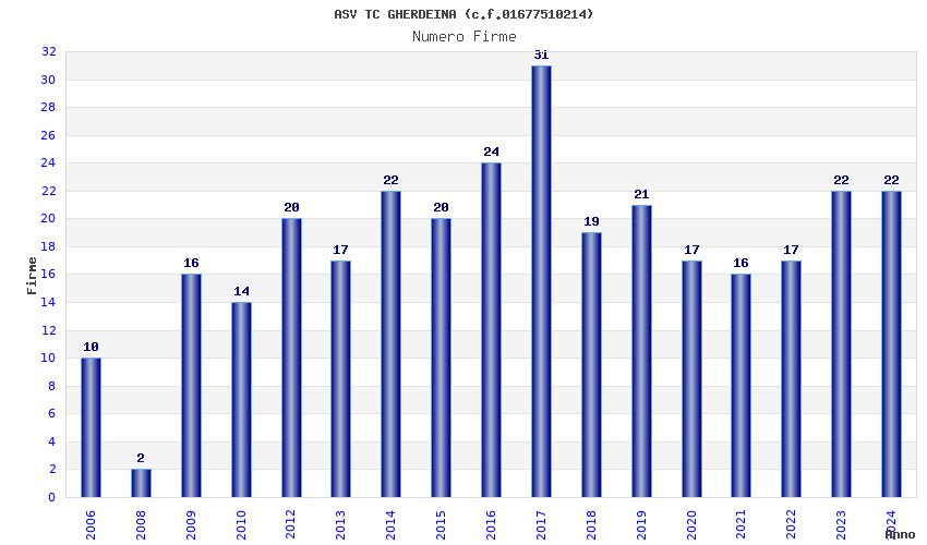 | 2014 | 22 | 1.606,55 | 73,03 | 24.715 | 743 | 370 | 2 |