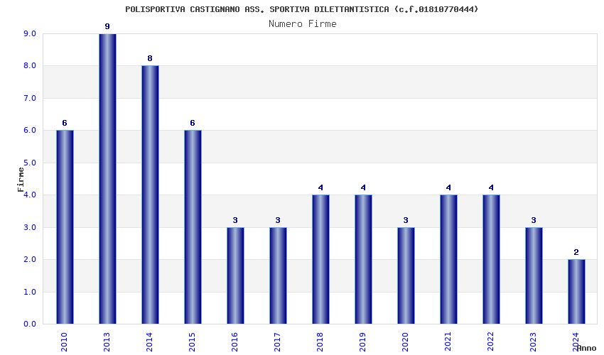 | Anno | Firme | Importi | Media | Naz. | Reg. | Prov. | Comu. |