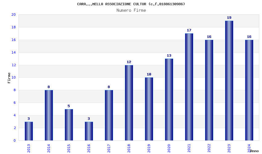 | Anno | Firme | Importi | Media | Naz. | Reg. | Prov. | Comu. |
