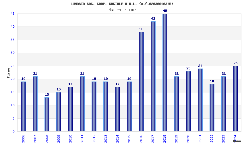 | Anno | Firme | Importi | Media | Naz. | Reg. | Prov. | Comu. |