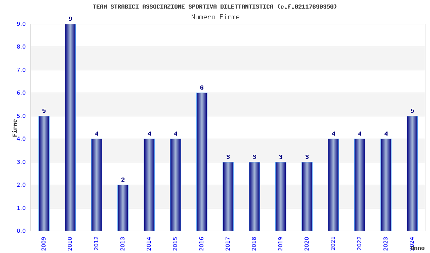 | Anno | Firme | Importi | Media | Naz. | Reg. | Prov. | Comu. |