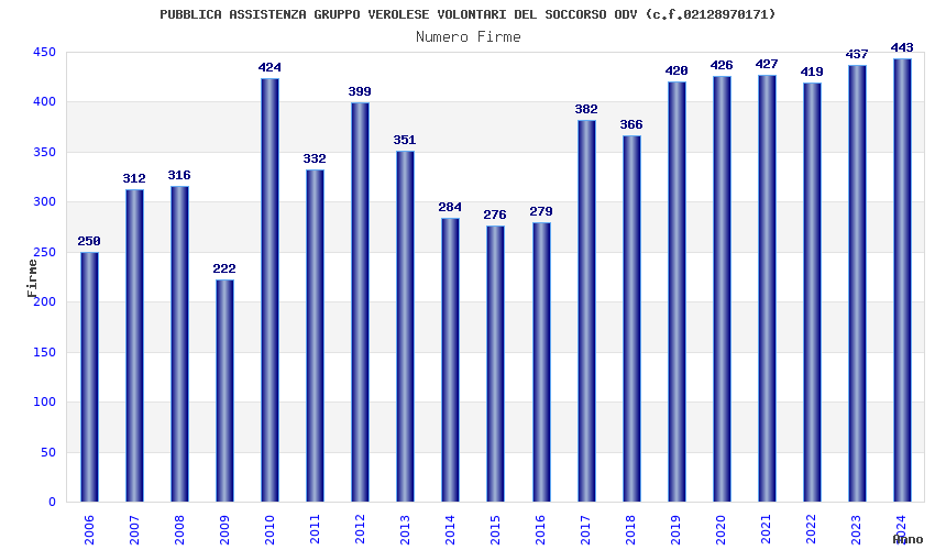 | Anno | Firme | Importi | Media | Naz. | Reg. | Prov. | Comu. |