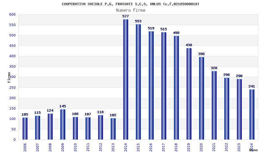 | Anno | Firme | Importi | Media | Naz. | Reg. | Prov. | Comu. |