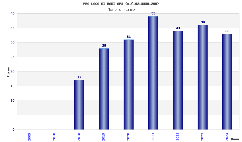 | Anno | Firme | Importi | Media | Naz. | Reg. | Prov. | Comu. |