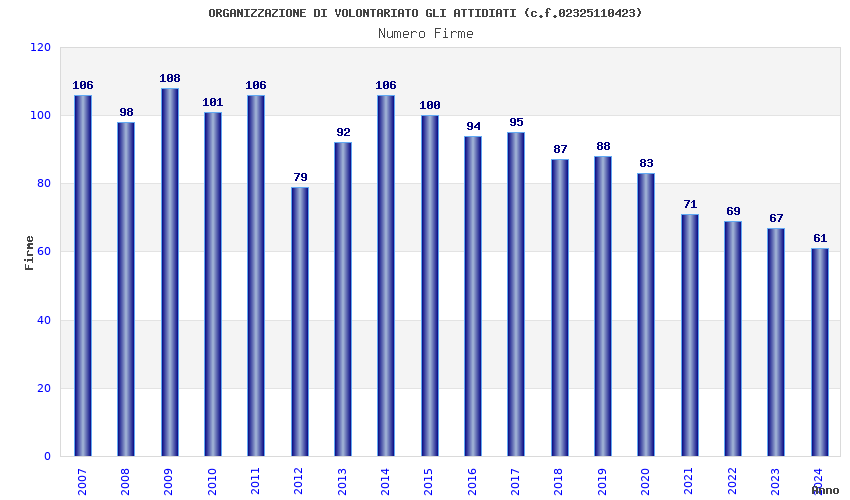 | Anno | Firme | Importi | Media | Naz. | Reg. | Prov. | Comu. |