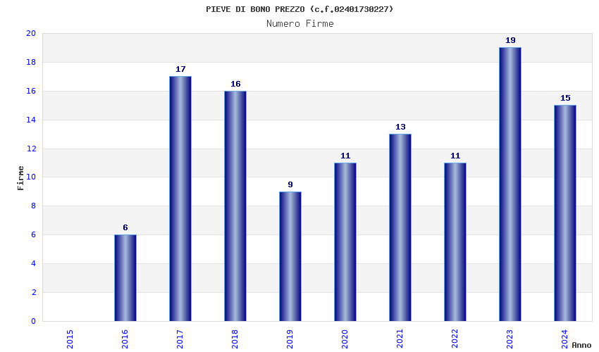 | Anno | Firme | Importi | Media | Naz. | Reg. | Prov. | Comu. |